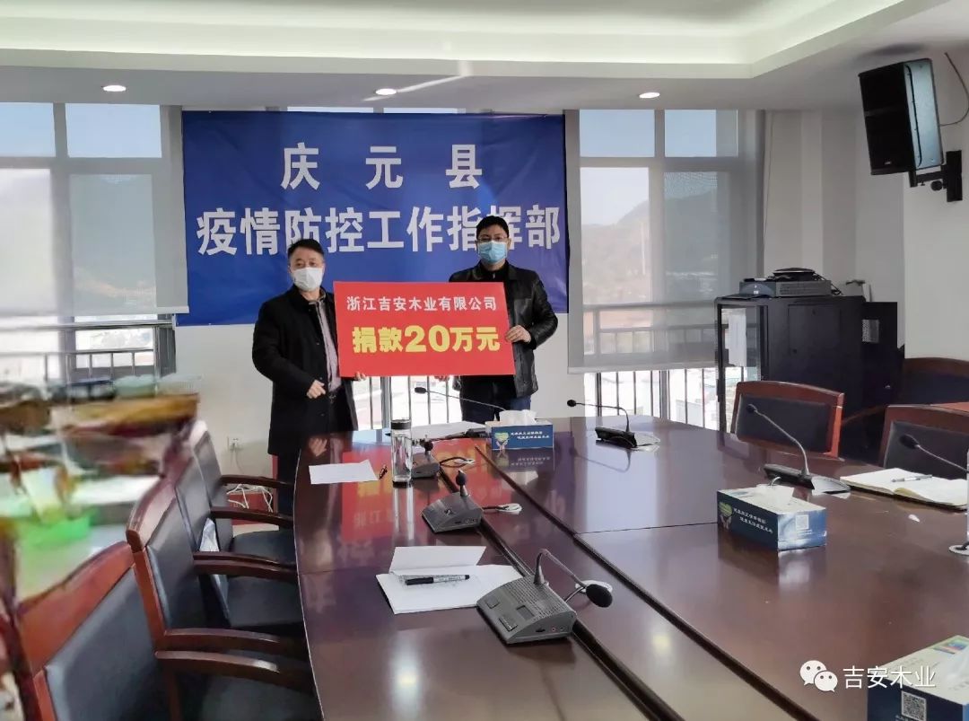 2020年2月1日; 吉安木業(yè)董事長(zhǎng)吳靜安赴疫情防空工作指揮部,捐款20萬(wàn)元。全力支持我縣新型冠狀病毒疫情防控工作,專(zhuān)項(xiàng)采購(gòu)醫(yī)療用品、口罩、防護(hù)服等急需物資。